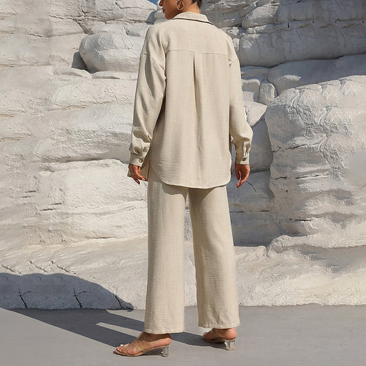 Women's Solid Color Lapel Collar Long Sleeve Shirt & High-Waist Pants Set - Casual Loose ...