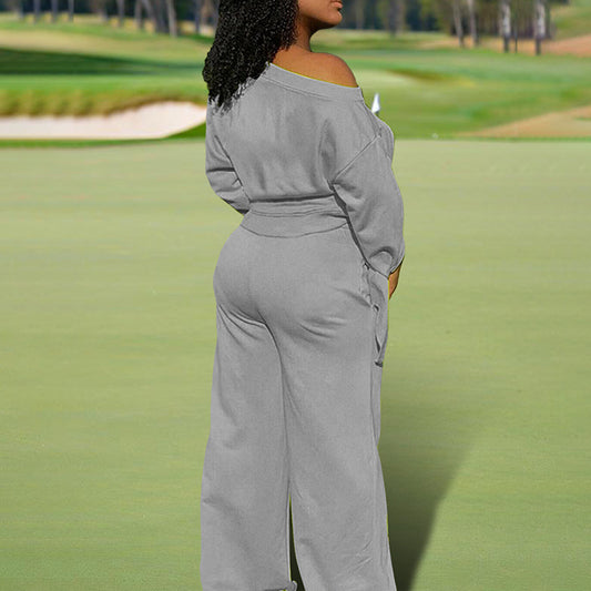 Women's One-Shoulder Casual Set - Solid Color Long Sleeve Top & Elastic Waist Pants With ...