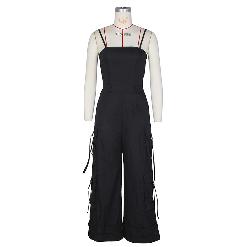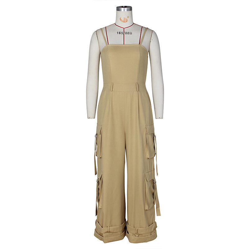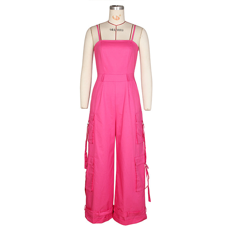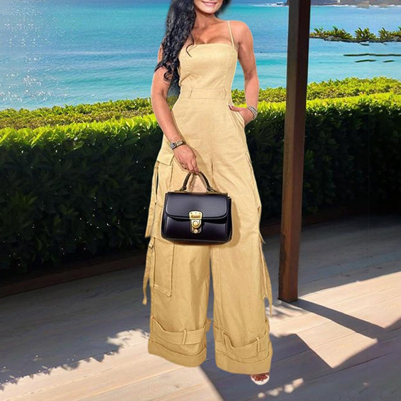 Stay cool and chic this summer with our Women's Solid Color Sleeveless Jumpsuit ! This trendy one-piece features a relaxed wide-leg silhouette with adjustable ankle hem for customizable styling, plus four functional pockets for both fashion and utility.